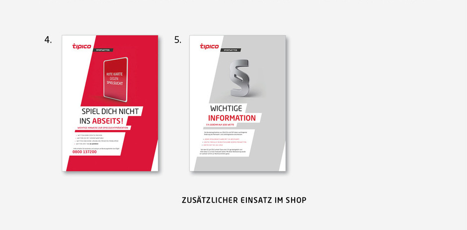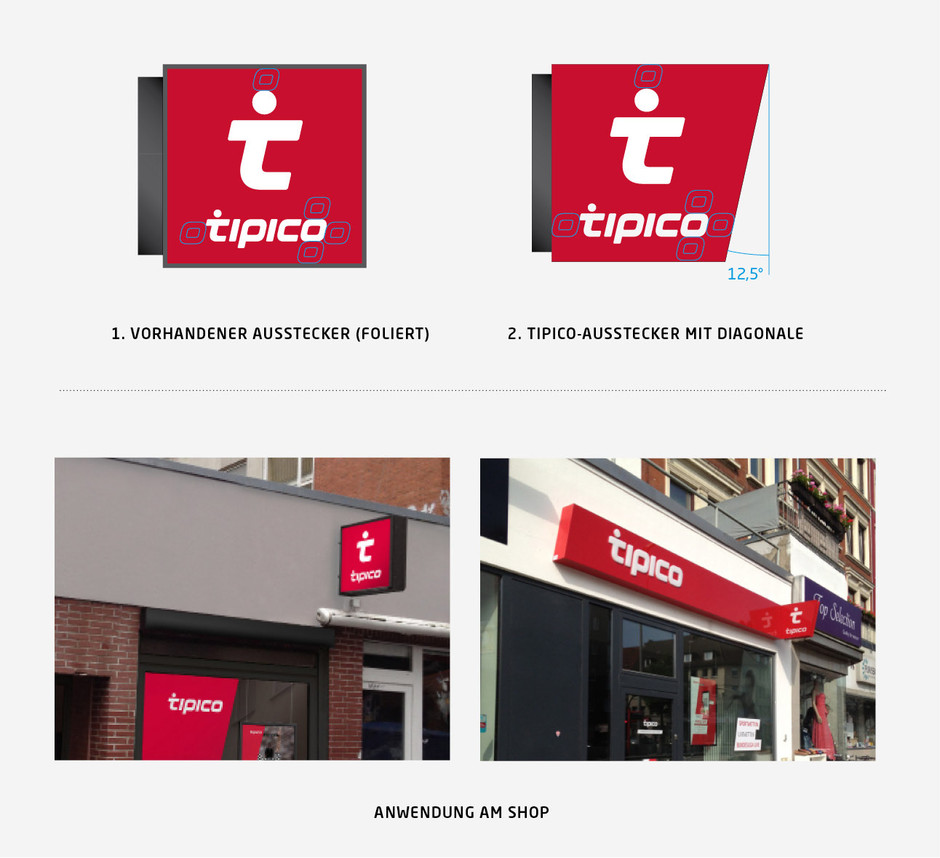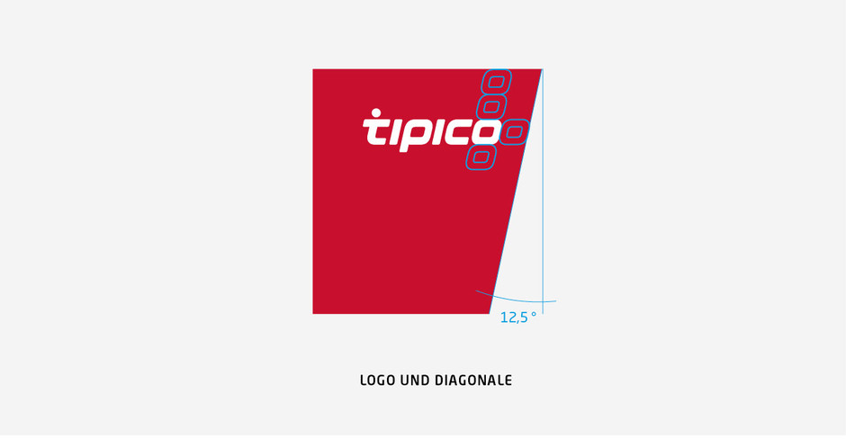 In retail branding the Tipico logo is used as a negative version with white letters on a red background. The Tipico diagonal is one of the most important design elements. The fixed angle of 12.5 ° is strictly observed.