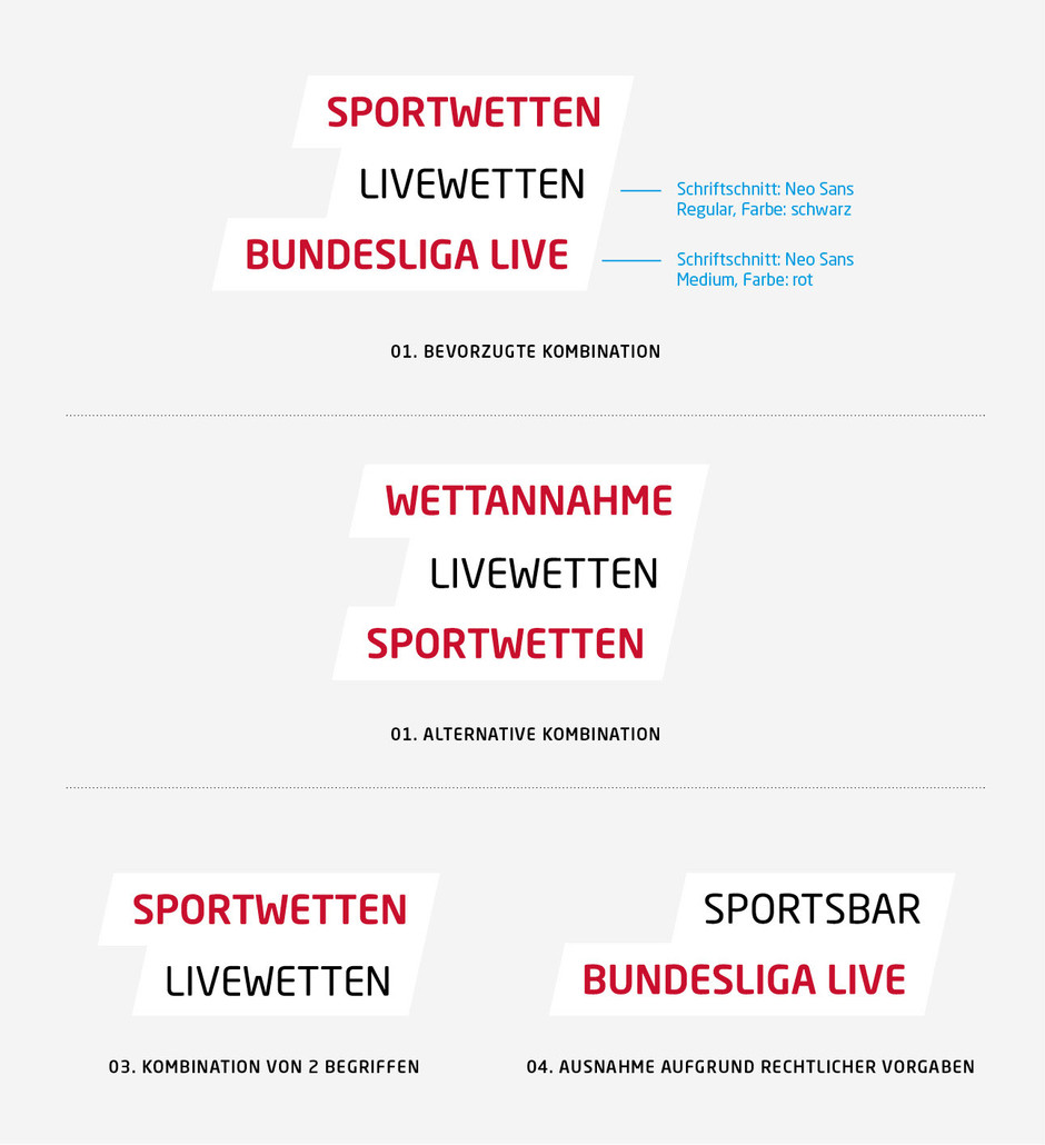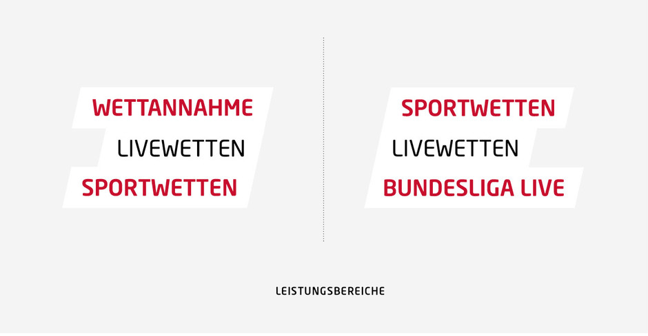 On the outside of the shop, a group of concepts communicates what it's happening inside. These "performance areas" are always connected to the Tipico diagonal (left or right alignment possible). Due to different legal conditions in the countries it may be necessary to use alternative terms (eg sports bar, sports café, betting). When the term "betting" cannot be used, version 4 may be used. Misleading terminology (eg "Sport café" without existing drinks license) and content duplication (eg sports café, sports bar) are to be avoided.