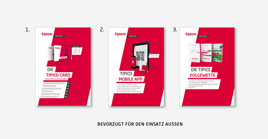 For outdoor display, the posters "Tipico Card", "Mobile App" should be used. The design "follow bet" may be used when needed.