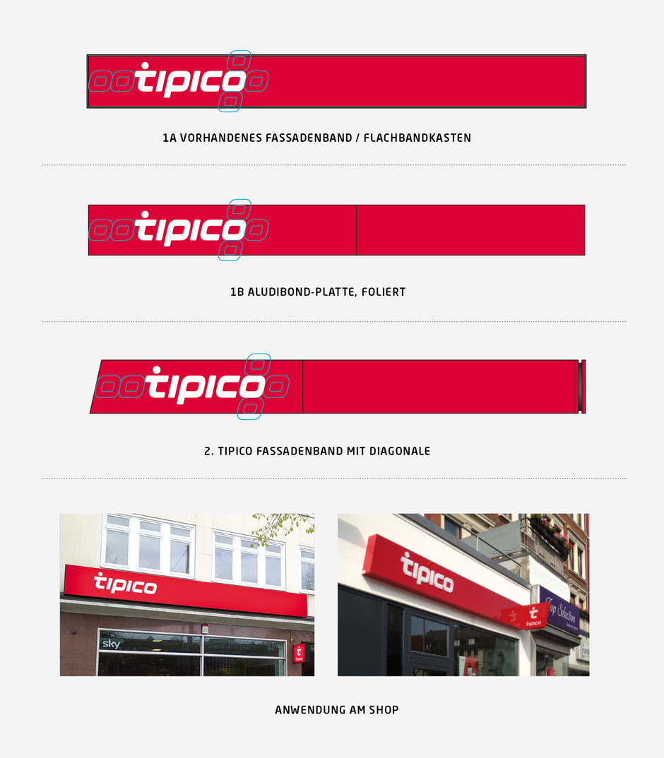 There are 3 possibilities: Existing ribbon boxes can be re-foiled (1a) or the quality Tipico façade band with diagonal (2) can be installed. As a low cost, non-illuminated alternative a lacquered/foiled Aludibond plate can be mounted above the window (1b).