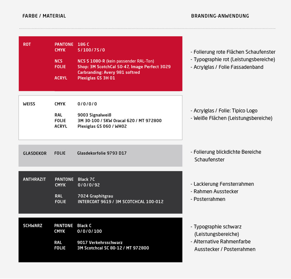 In order to ensure a uniform reproduction of Tipico Corporate Colours in retail branding, the colors and materials have been adapted from the print color as much as possible. The material specifications for black and white films and materials are exemplary. It's also possible to order alternatives from other manufacturers, but they must be sampled prior to the application and agreed with Tipico.